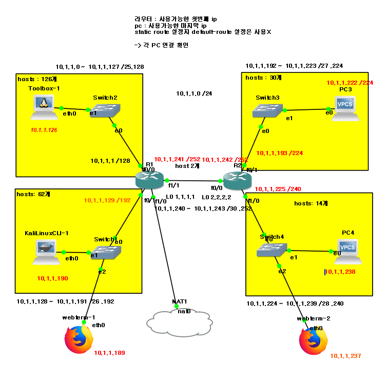 GNS3 환경에서 구축했고 네트워크 구성도는