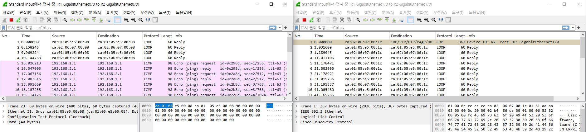 PC1과 PC3 간의 트래픽은 위쪽 경로를 , PC2와 PC4 간의 트래픽은 아래쪽 경로를 이용함을 확인했다.