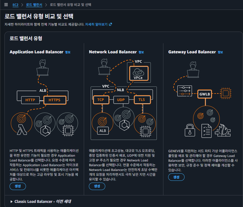 Classic Load Balancer : ALB나 Network Load Balancer가 등장하기 전에 쓰이던 오래전의 로드 밸런서다. 기존의 AWS 시스템을 사용해야 하는 특별한 경우가 아닌 이상 새롭게 쓰이지는 않는다.