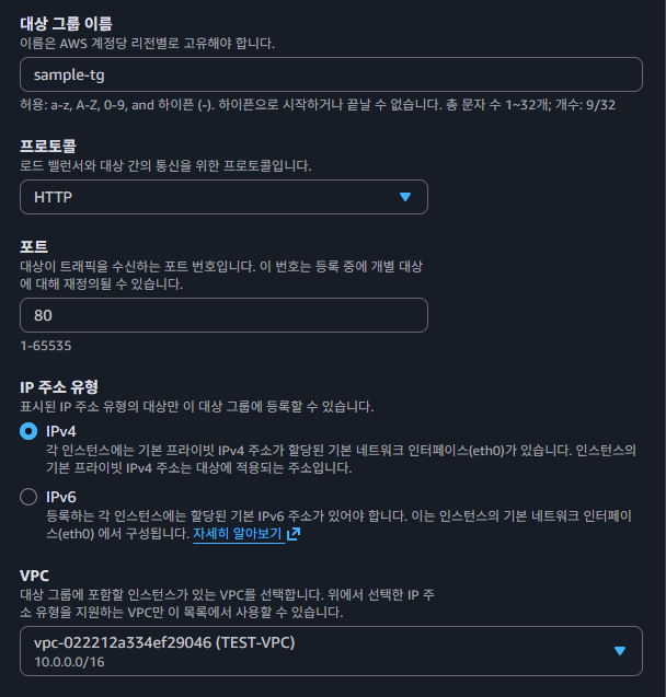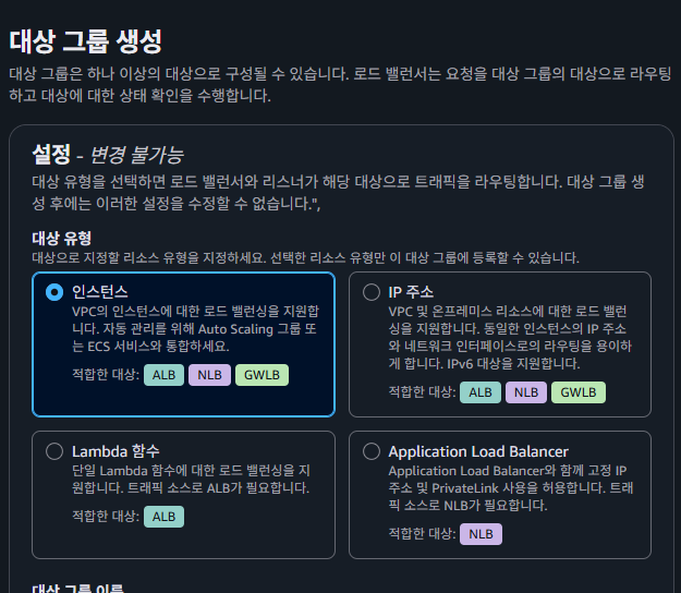 7. 다시 로드 밸런서 생성 으로 돌아와서 대상그룹 선택에서 방금 만든 대상그룹을 선택한다.