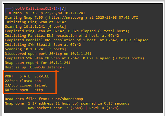 └─# nmap -v -sS -p 22,23,80 10.1.1.241
