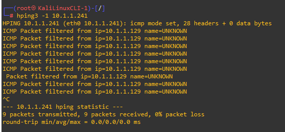 R1에 적용된 ACL이 정상적으로 적용되어 kali의 ping 공격이 완벽하게 차단되고 있다.